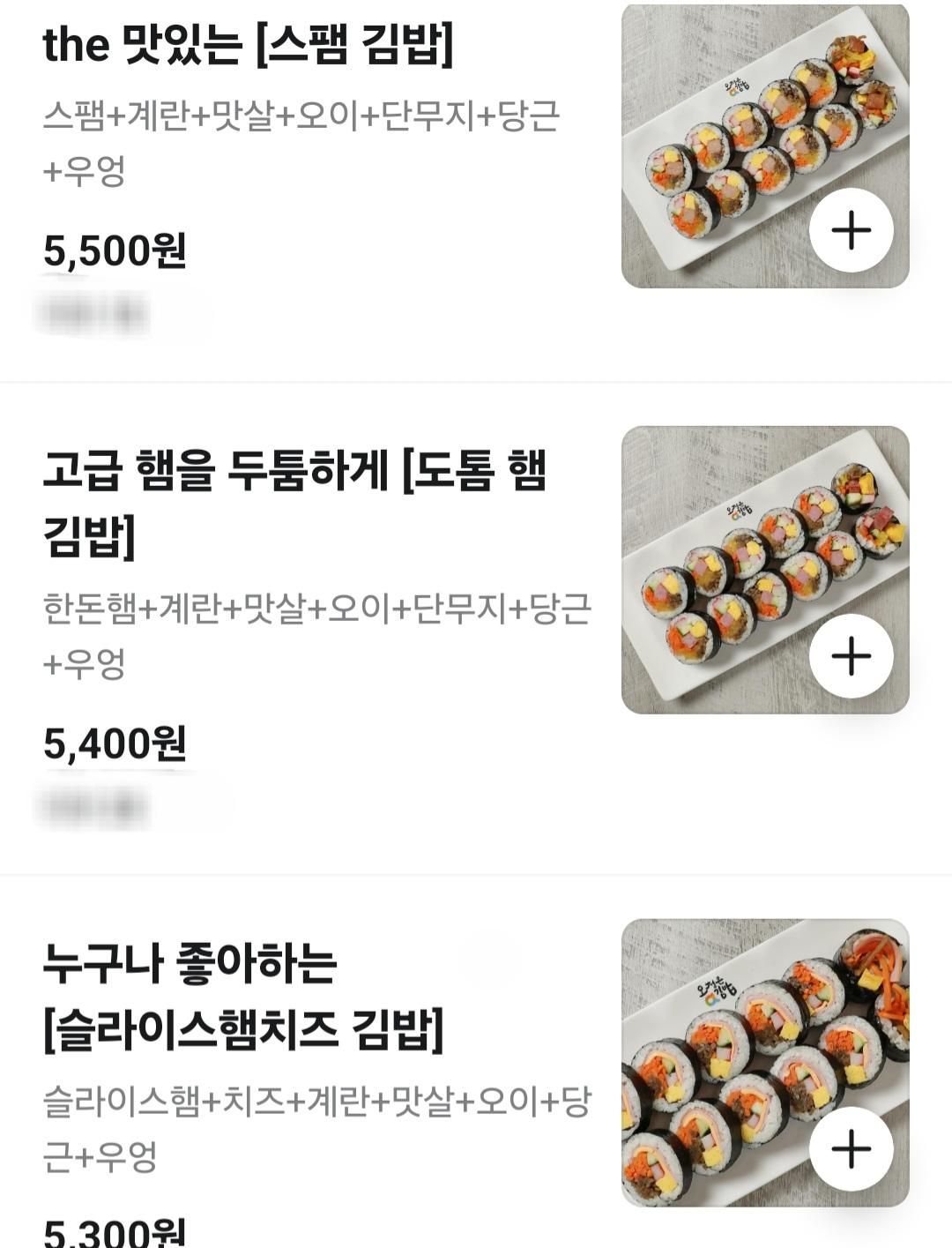 김밥(업체마다 다르지만) 안에 재료 7-8가지 들어갑니다.